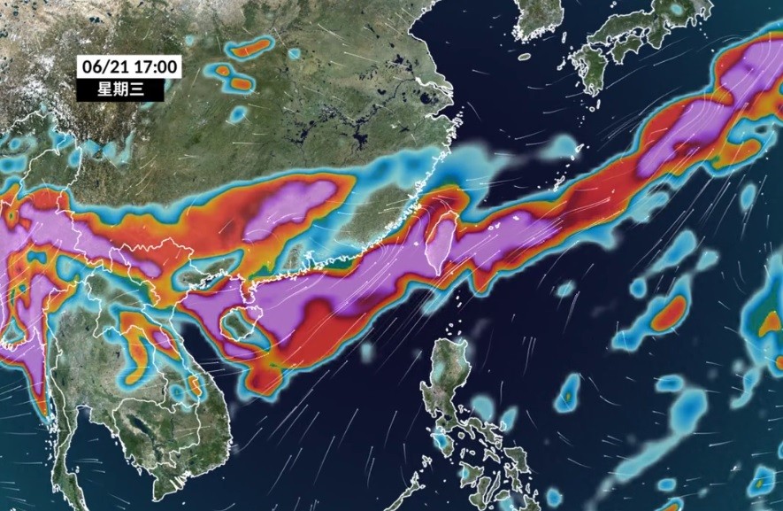 連續幾天都是午後雷陣雨的夏季天氣,高溫普遍34至35度,部分地方甚至可以達36度,在太陽底下曬過15分鐘,就有可能會曬傷,並要留意中午過後熱力對流發展,山區有雷雨,下周二起,新的梅雨鋒面接近台灣,周三配合較強的西南風水氣,彭啟明提到,「可能就會發生集中型的暴雨,在短時間內降下大量雨水並且造成災害。」