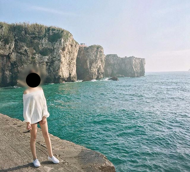 網有於批踢踢「高雄版」發文,表示看到部落客拍的照片,覺得很漂亮,但是不知道景點在哪裡,所以才上網詢問,照片中可以看見,一名穿著一字領的長腿妹,站在岩石上,後方就是綠色海水,美景圖讓人眼睛為之一亮。
