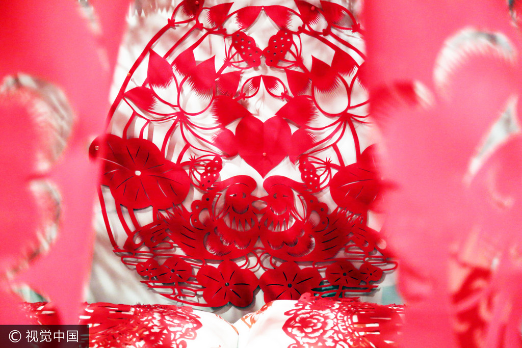 ▲「鴛鴦戲荷」剪紙婚床。(圖/CFP,下同)