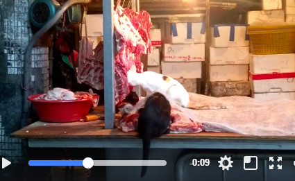 在泛黃燈光下,這間豬肉攤販的檯子上,擺滿新鮮肉塊,卻不見老闆人影,仔細看竟有3隻貓咪踩在上面,忘我的咀嚼著豬肉,十分享受。