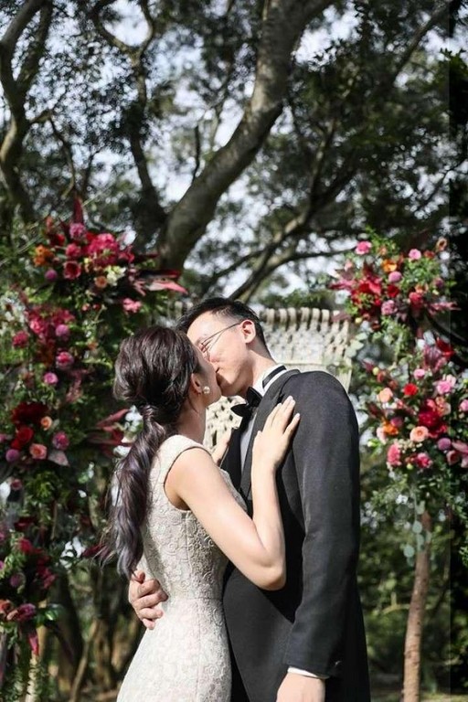 林飛帆一身黑色燕尾服,帥氣打扮,牽著妻子林雅萍的手,替她戴上戒指,在親友見證下,由柯一正證婚,替兩人獻上祝福。
