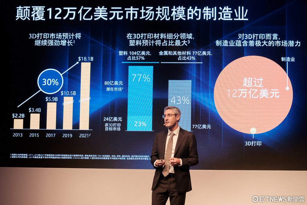 HP Multi Jet Fusion 3D 列印解決方案副總裁兼總經理 Ramon Pastor,就以自家的研究報告闡述,在 2013 時 3D 列印產值僅 22 億,2017 今年則是來到 59 億,預估在 2021 年時,就會達到 181 億美金的水準,可說成長幅度達 3 成;另外,搭配目前世界製造業總產值高達 12 兆美金的狀況下,他認為 3D 列印的前景與潛力還是相當足夠的。