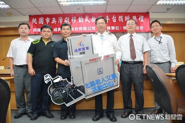 製造無障礙輔具的桃園市大溪區成昇實業公司,13日由董事長莊萬益、總經理莊濠榮,捐贈6台無障礙移動式輪椅平台給桃園市政府,由市長鄭文燦、社會局長古梓龍代表接受。市府受贈的6台無障礙移動式輪椅平台,將分別設置在北區老人文康中心、僑愛國小、大溪國中、仁和國中、大溪高中和至善高中。