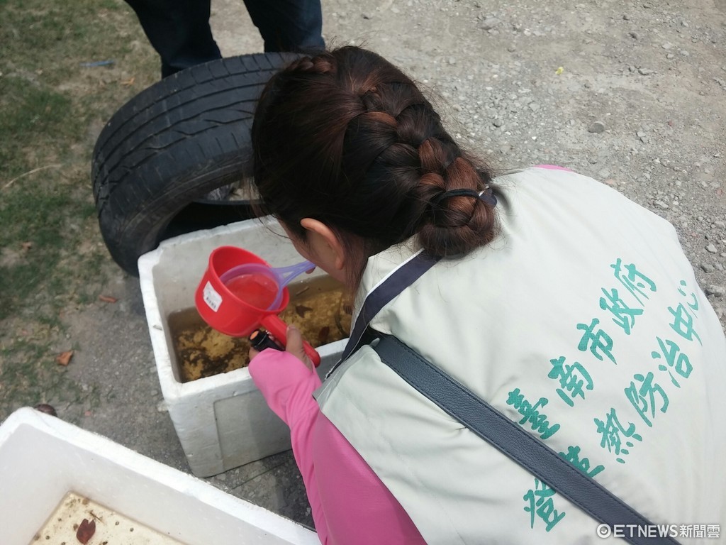 ▲台南市衛生局稽查人員,檢查登革熱病媒蚊陽性積水容器。(圖/衛生局提供)