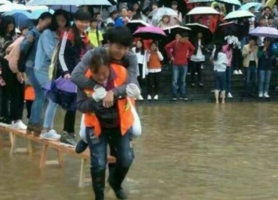 貴州近來暴雨造成積水未退,難以行動,六盤水師範學院15日臨時搭了「椅子橋」,讓學生、老師通行,但校方也請8位清潔阿姨背著學生離開,畫面被學生錄下上傳網路,引發網友熱烈討論說,「有沒有這麼嬌貴」。