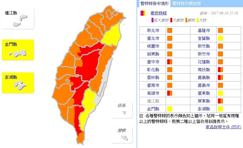 受到滯留鋒面及西南氣流影響,中央氣象局今(16日)下午至明(17)日西半部地區、花蓮山區有局部大雨或豪雨。其中宜蘭地區、台東山區及澎湖、金門有局部大雨,明日台中、南投、嘉義、高雄及屏東山區更是要嚴防大豪雨,要注意瞬間大雨、雷擊及強陣風,連日降雨,山區慎防坍方、落石、土石流及溪水暴漲,低窪地區慎防淹水。