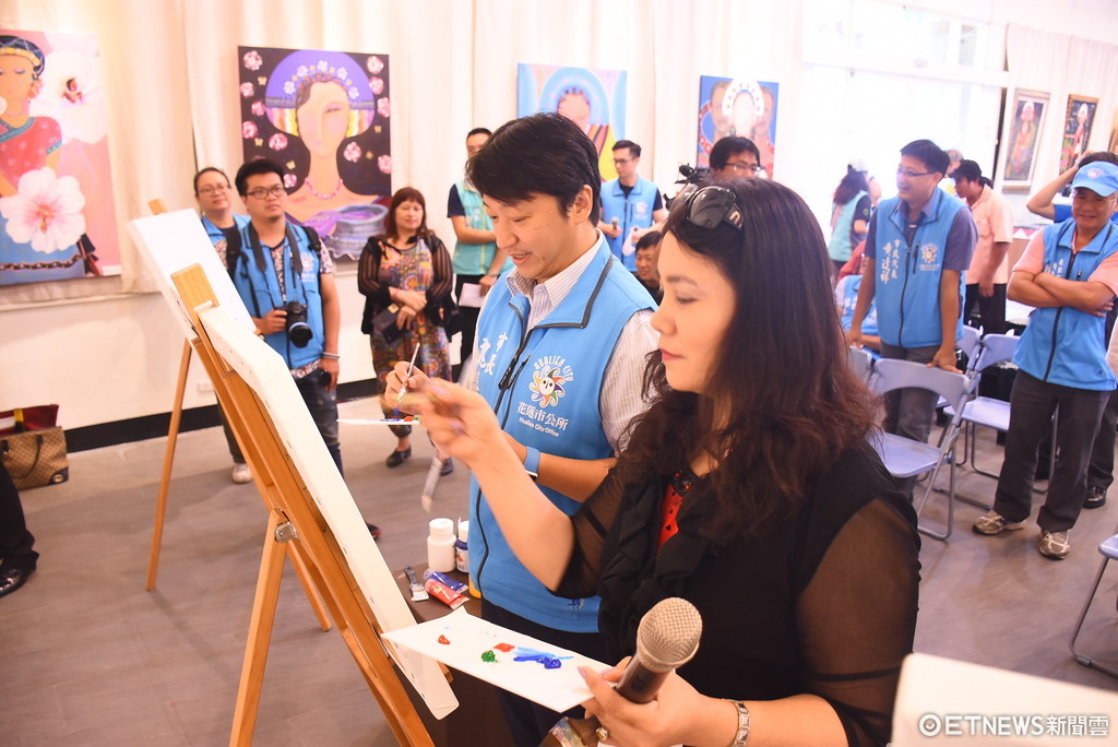 ▲花蓮市原住民文化歷史館展出蘿艾絲•拉坦的「金色年代~阿美族絕代風華巡迴個展」,現場邀請市長魏嘉賢畫畫。(圖/花蓮市公所提供 下同)