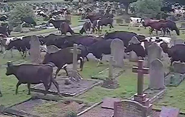 從錄影帶中可見,牛群以非常快的速度闖入墳場,看不出是被什麼追趕,有些牛隻在吃墳場內的草,有些則到處亂晃,最後終於被人驅趕出去。據悉,這些牛隻當時應是受到驚嚇,才會集體衝出牧場,撞壞墳場的柵欄。