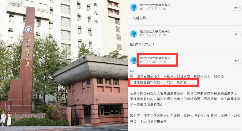 日前有政大歷史系網友在Dcard貼文,抱怨抽到候補選填宿舍,結果運氣不佳,只能付高昂的住宿費入住較高級的社區。結過,該文吸引了一名政大會計系學生留言,只因為一句「你不也文組」,他氣到火力全開,怒嗆讀歷史根本沒前途,指世界上可以分成2種人,「一種是可以被維基百科取代的人,例如你;一種是維基百科取代不了的人,例如我。」