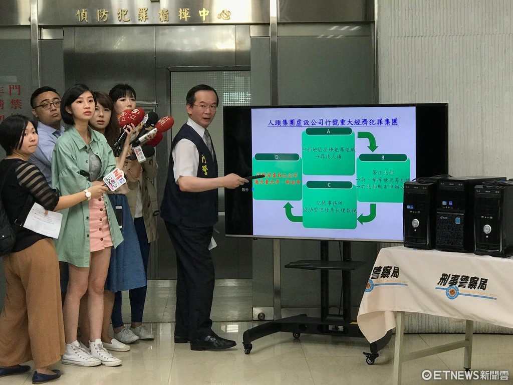 專案小組在2016年就接獲線報,以嫌犯吳英裕(59歲,竊盜通緝)、盛永鑫(53歲)、吳廷華(49歲)、賴弘軒(53歲)為首的犯罪集團等20人,涉嫌以人頭設立公司進行逃漏稅、詐貸銀行等手段進行牟利。