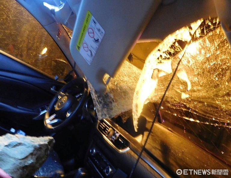日前晚間,家住台中市南屯區的的李姓男子冒雨駕車從花蓮出發,經中橫公路欲返回台中,於晚間7時38分經過163.6K迴頭彎時,突然1顆大石頭從天而降,恰巧落在車頂正上方,過猛的落勢砸穿車頂,就落在李男的右方半公尺,砸壞了扶手置物箱及手煞車。