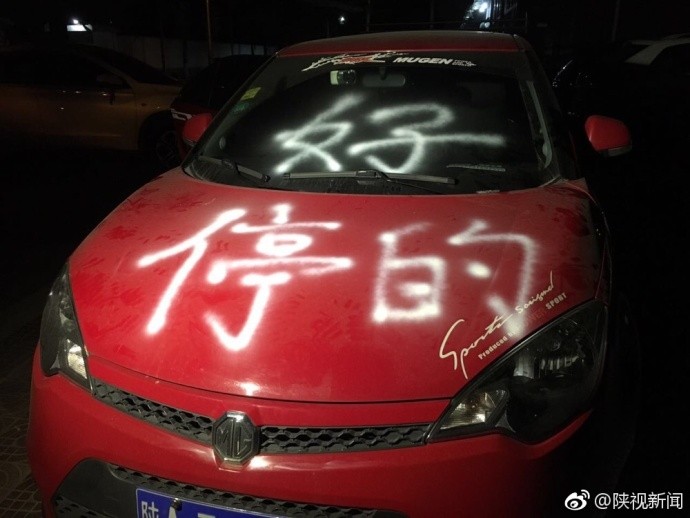 陝西省西安市一名男子於18日至方新路吃飯,因為沒車位,他便索性將車子停在停車場的車道中間,想不到吃完晚餐後,他回去牽車時發現,愛車的擋風玻璃被人用白色噴漆寫了「停的(得)好」3個大字。
