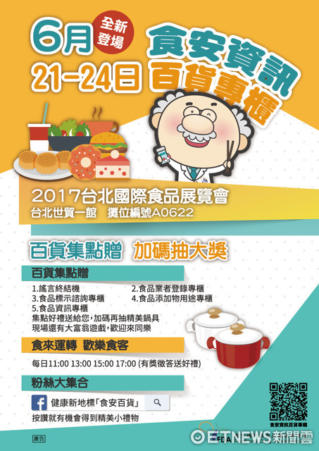 為提供民眾查詢正確且便捷之食品安全資訊管道,去年底食品藥物管理署建置「食安資訊百貨專櫃」網頁,並自6月21日至24日於台灣國際食品展覽會展開全台巡迴活動,讓民眾對各專櫃內容有更深的認識,後續將參與7月台灣美食展、台中休閒美食展及10月的高雄國際食品展覽會。