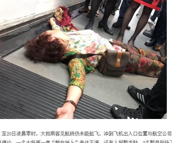 香港航空一拖再拖,6點廣播說「晚上8時30分起飛」,9點再次說「預計20日淩晨零時才能起飛」,引發眾多乘客不滿。有一位中國大媽等到凌晨,情緒一時往上湧,直接衝向機艙門口躺了下來,雙手大開,以示抗議。可不只這位大媽激動,有乘客激動的與航空公司的職員理論,還有人報警處理,現場一陣混亂,最終在3位員警的安撫下,才平息眾怒。