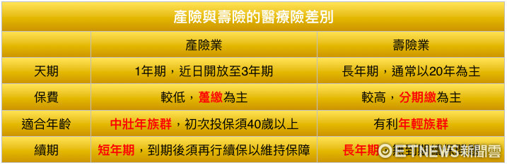 ▲產險與壽險的醫療險差別比較。(圖/記者官仲凱製表)