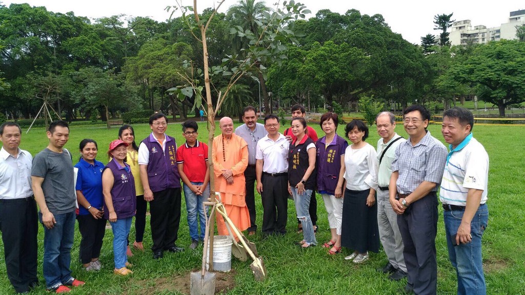 受台北瑜珈境創辦人羅明璋邀請到台灣的印度上師「阿希帝亞曼難陀」是古加拉地州立大學瑜珈與吠壇多學院院長,所主持的施化難陀修道所位於印度古吉拉特邦亞美達巴市,也是印度國父甘地及現任總理納倫德拉.莫迪的故鄉。今天(21日)的活動中,上師與台北市議員應曉薇聯手種了兩顆花語為「感謝」的黃花風鈴木,並且將樹取名為「愛國」,植樹現場同時貴賓雲集,包括印度僑胞協會主席、公燈處處長黃立遠、青年公園所楊主任、萬華區聯誼會會長張鴻杰並帶領青年次分區7位里長共襄盛舉。
