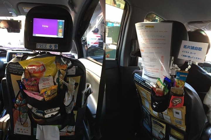 原PO表示說:「太貼心的計程車司機,餅乾行動電源飲料什麼都有,覺得好心情。」並且上傳幾張車內圖片,畫面中可以看見,前座椅子後方掛滿著各式各樣的東西,除了有零食、餅乾、巧克力之外,還有行動電源、隨身衛生紙方便乘客使用,椅子後方還有冰箱可以喝到冰飲,讓他大嘆:「真是太佛心了。」