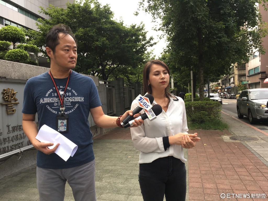 ▲超人氣娛樂公司23日派人到刑事局報案,並在門口接受媒體訪問。(圖/記者柳名耕攝)