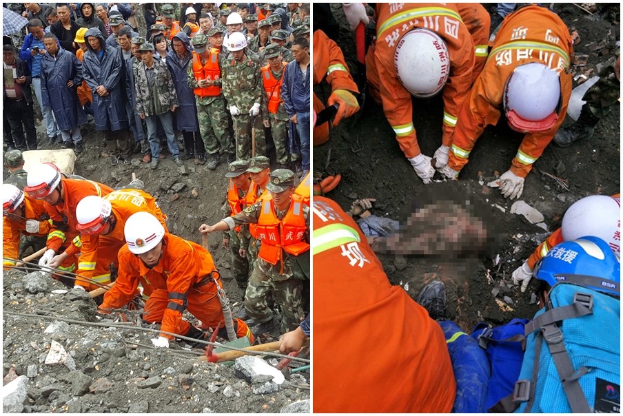 中國四川24日早上6時發生山崩意外,造成河道堵塞2公里,46戶住處、100多個人遭活埋。搜救人員挖掘一對男女遇難者,發現男子在最後一刻將女子護在身下,遺憾的是兩人已經沒有任何生命跡象。