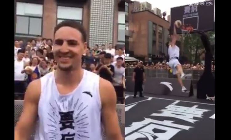 NBA勇士球星「K湯」(Klay Thompson)日前造訪大陸參加宣傳活動,在活動中他本來想灌籃小試一下身手,不料卻連續被籃框賞了2個火鍋,沒扣進還尷尬倒地,逗趣畫面也在網路瘋傳,引起不少球迷討論。