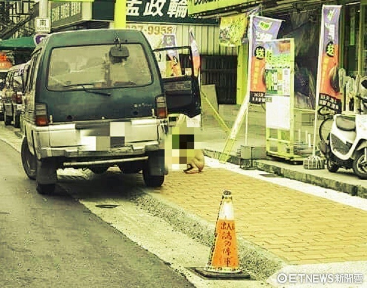 照片中,只見一台箱型車的右邊車門是打開的,把視線移到右下角,可以看見1名小孩脫褲子多在地上,沒多久後就站了起來穿褲子,完全沒有在意路人的眼光,而且從後車窗隱約能看見,車上似乎有大人正在等小孩上完廁所。