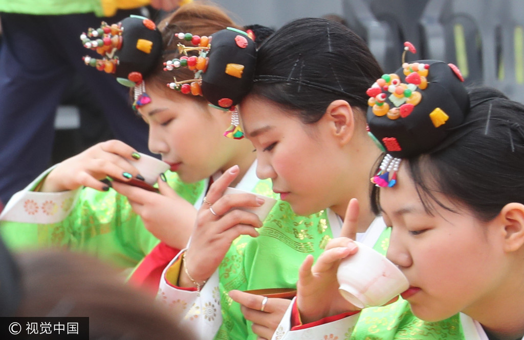 ▲韓國女大學生穿韓服參加成人式,並跪謝父母養育之恩。(圖/CFP)