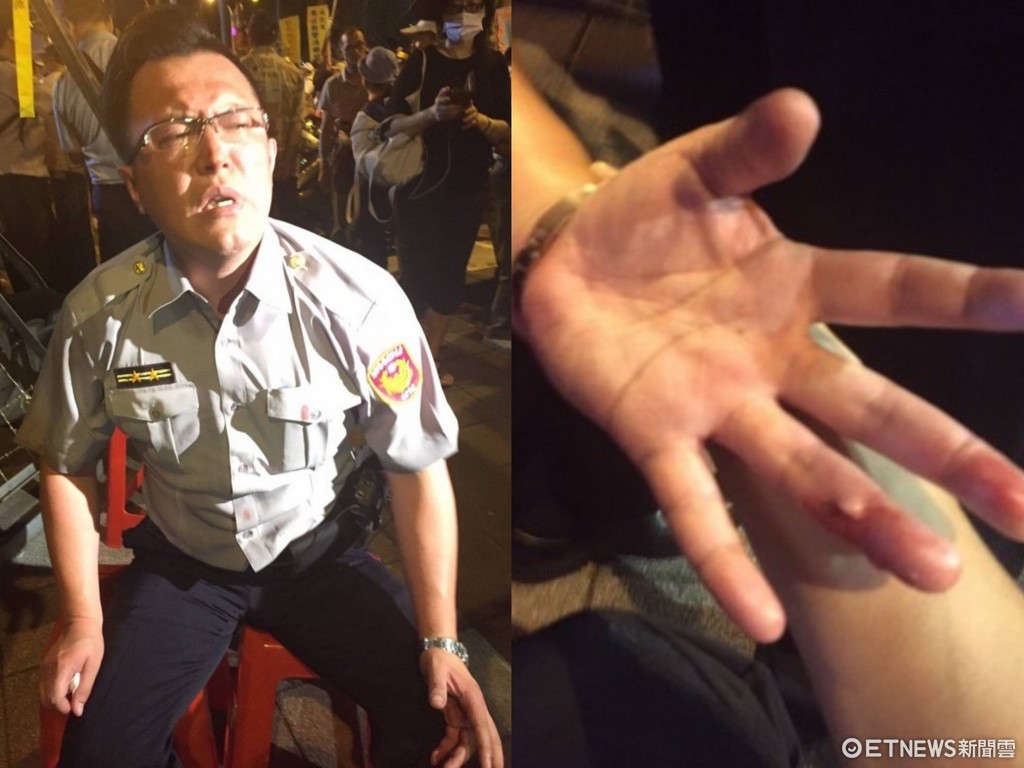 ▲大安分局新生南路派出所所長崔企英在維持反年改秩序時遭割傷,在醫院縫了3針後又回到現場繼續執勤。(圖/記者柳名耕翻攝)