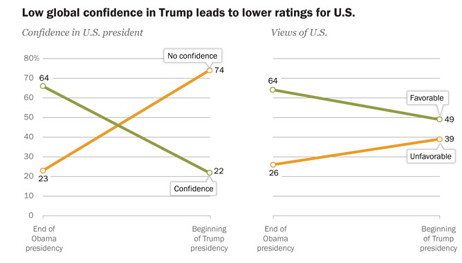 川普在擔任美國總統期間,全球民眾對美國的好感度跌至49%,比歐巴馬在位後期的64%還下降了15個百分比,而對美國不抱任何好感的受訪者為39 %,增加了13個百分比,這樣的好感度和美國前總統布希在2003年入侵伊拉克時一樣,不受海外人民歡迎。