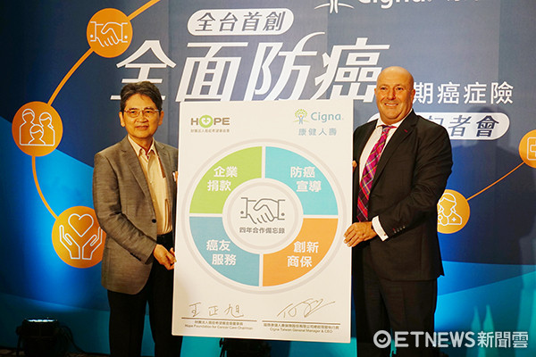 ▲康健人壽推首創癌症復發給付保單,圖右為康健人壽總經理邵駿崴、左為癌症希望基金會董事長王正旭醫師。(圖/記者官仲凱攝)