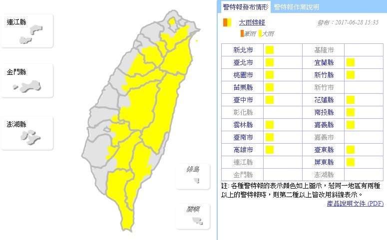 氣象局下午15時35分針對台北、新北、桃園、新竹、苗栗、台中、南投、嘉義、雲林、台南、高雄、屏東以及宜蘭、花蓮、台東等15縣市發布大雨特報。此外,16時20分也發布大雷雨即時訊息,地區為高雄市(美濃區、六龜區、甲仙區、杉林區、茂林區、桃源區、那瑪夏)。