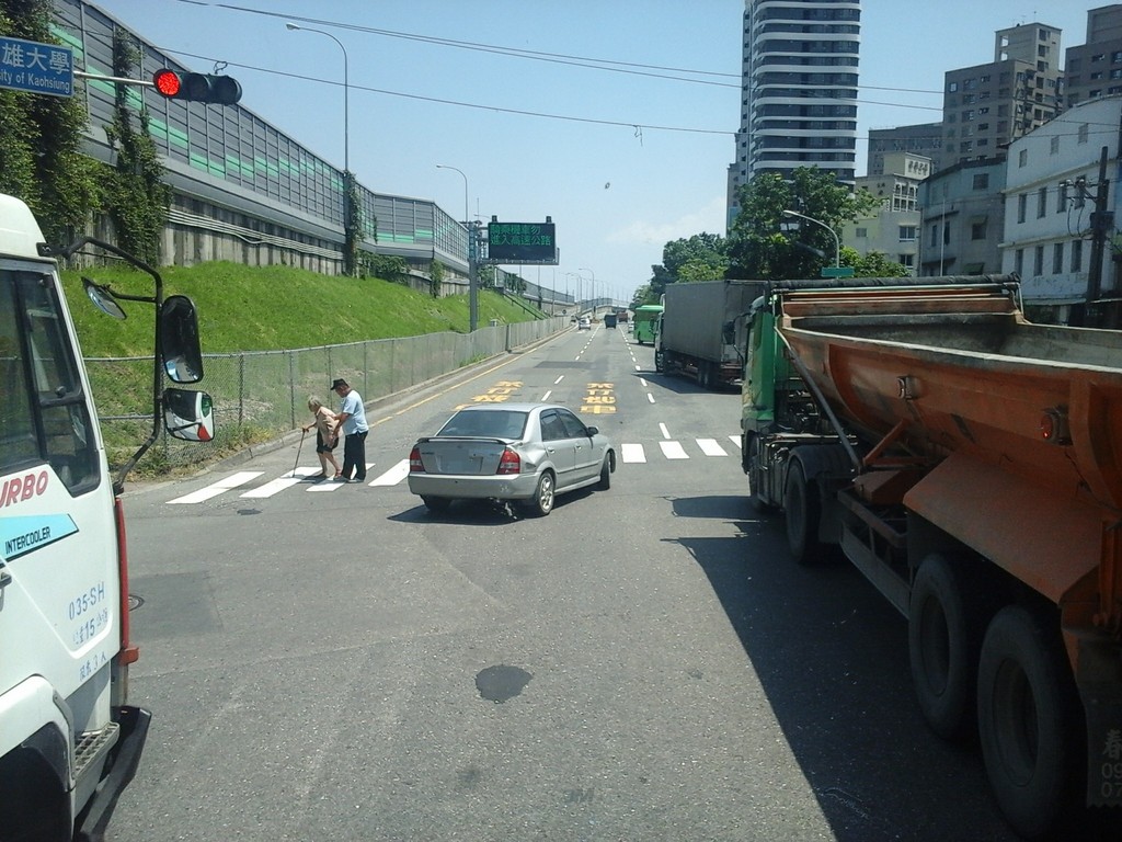 陳姓網友28日下午1時許在「聯結車 大貨車 大客車 拉拉隊 運輸業 照片影片資訊分享團」臉書發文,正值下午太陽最炙烈時刻,卻在楠梓交流道遇見一位「黑米大哥」半路停車下去扶著阿婆過馬路,這畫面真的很美,想給這位大哥一個讚!