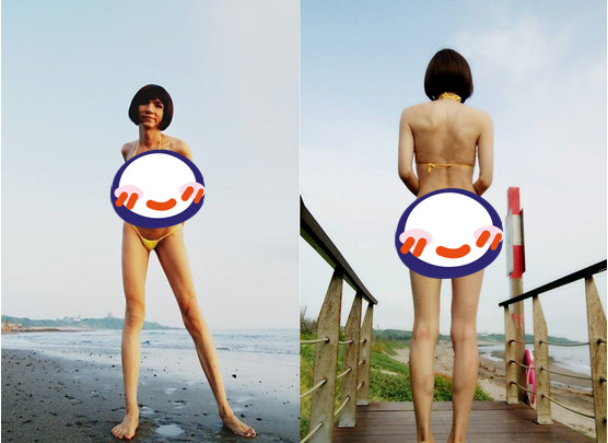 照片中,從背影看上去,只見一名四肢纖細的的短髮正妹穿著黃色的比基尼,沒想到一拍到正面,瞬間讓人鼻血直流,比基尼的布料完全遮不住雄偉的上圍,只遮得住點而已,外表看上去,完全就像是一名長腿美眉,沒想到竟然是男兒身。