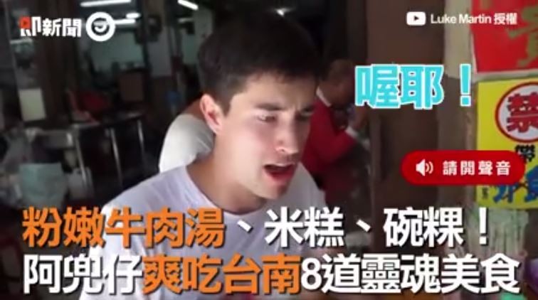 Youtuber「Luke Martin」經常用美食介紹世界各地,這次他來到台灣台南的水仙宮市場,拍攝了一部「阿兜仔帶你吃台灣小吃」的影片,吃遍台南的8樣靈魂美食。許多網友看了影片之後,紛紛對Luke Martin敢吃那麼多台灣食物感到訝異,甚至認為他「很適合當台南人」;還有人不小心歪樓表示,「甚麼都敢吃真的很厲害,但重點是他還蠻帥的」。