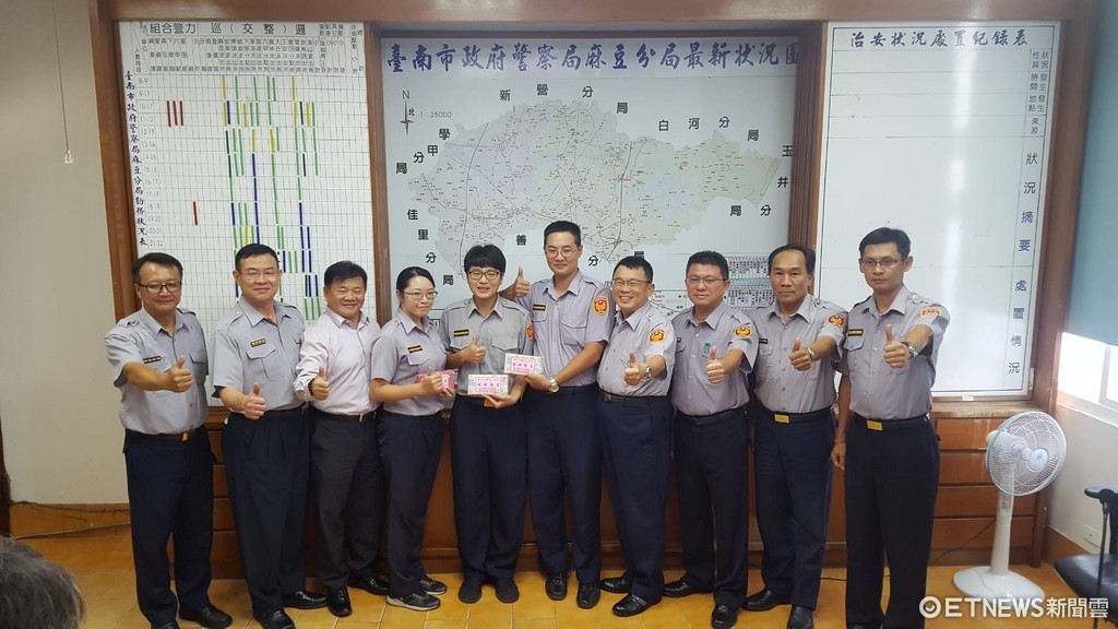 ▲中央警察大學106學年度學士班二年制技術系日前放榜,麻豆分局警員鄭翔予等3人金榜題名,麻豆分局長蔡進閱等人致贈紀念品,祝賀金榜題名。(圖/警方提供)