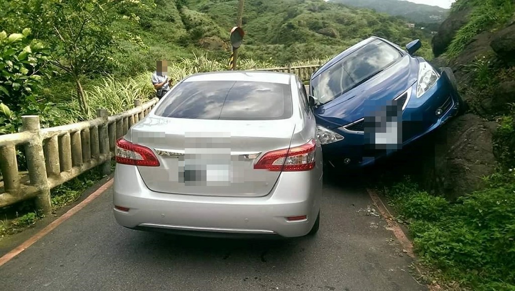 ▲肇事車輛卡在山壁與原PO轎車之間。(圖/翻攝自爆料公社)
