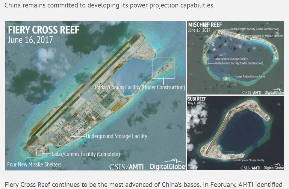 AMTI指出,中國在南沙三大人造島礁上不斷擴大通訊及雷達設施,主要有2大目的,一是監測南中國海的活動,二是在西太平洋投射力量;中國增強軍事的行為可能會影響到菲律賓的巴拉旺島鄰近美濟礁。AMTI指出,儘管中國聲稱自己持續專注於與東南亞相關國家在南海議題上的協商談判,但他們仍持續軍事化南沙群島、不斷進行建設。