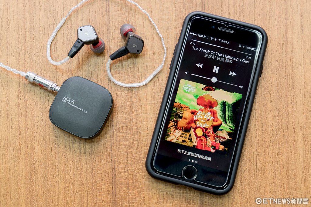 此次試聽搭配的是偏向高階的 Sennheiser IE80 耳道式耳機,並搭配 iPhone 7 以及 Spotify 作為音源裝置,雖然沒有高解析度的音樂試聽,不過再搭配 16 歐姆低阻抗的 IE80 情況下,AQUA+ 的推力相當充足,且入耳式耳機比較詬病的窄音場,經由擴大機與 DAC 加持後,音場效果也變得寬廣許多,不過在低、中高三頻表現上似乎沒有特別強調,整體調性算是較為平均的。