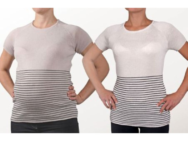 人客阿~你注意到了嗎?烘衣前後的差距居然可以差到3吋之多,這樣的物理效果嚴格來說並沒有什麼特殊之處,但設計師卻想到利用腰身線條的變化以及行銷手法來再次打響此件商品,上半身的白色衣服材質不會隨著烘衣而縮小,但腰部以下的黑色線條則是不同的材質。從此以後懷孕的媽媽可以在身懷六甲時大肆購物了(這時候親愛的老公應該也不會多說什麼吧!),衣服太大怎麼辦?通通丟到烘衣機烘小囉XD