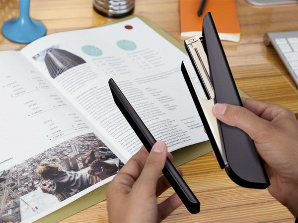 釘書機是日常生活中經常被使用的裝訂工具之一,也因為原本的設計,大家對於釘書機印象僅能用來裝訂文件的邊界,如果像是書本中間的裝訂線,可能需要使用特製的大型釘書機器,才有辦法做到。一定也有朋友想到將釘書機拉成平行後,就可以不被原本設計的長度侷限使用,但是往往不是墊在底下的材質不夠硬,讓釘書針卡在上面,就是力道不對,導致釘書針還沒穿過紙張就先變形了,要怎麼解決這個不便利的地方呢?聰明的設計師已經替我們想到,關鍵就在磁力!只要小小的改變一下釘書機的構造,使用起來就可以更便利,也不受紙張大小長度和厚度的影響囉。