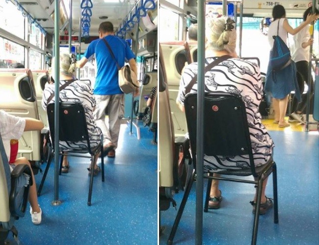 博愛座的設立原是美意,但常傳出一些讓座糾紛,新北市一名網友就分享,30日搭公車時,看到一名阿嬤沒有坐在公車的椅子上,而是坐在一張黑色的鐵製椅子上,「要下車的時候,連同椅子一起帶下車!」讓他相當驚奇,網友則留言,「果然是十大武器之首!」「根本是不求人椅。」