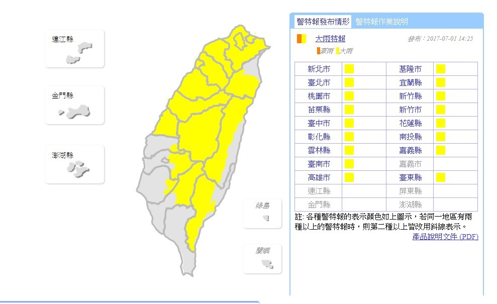 今天上午一樣炎熱,台北市、屏東縣體感溫度飆上42度、新北市、台中市、彰化縣、南投縣都可到41度,不過午後熱對流發展旺盛, 中央氣象局在下午2點25分針對基隆市、台北市、新北市、桃園市、新竹縣、新竹市、苗栗縣、台中市、南投縣、彰化縣、雲林縣、嘉義縣、台南市、高雄市、宜蘭縣、花蓮縣、台東縣等17縣市發布大雨特報。