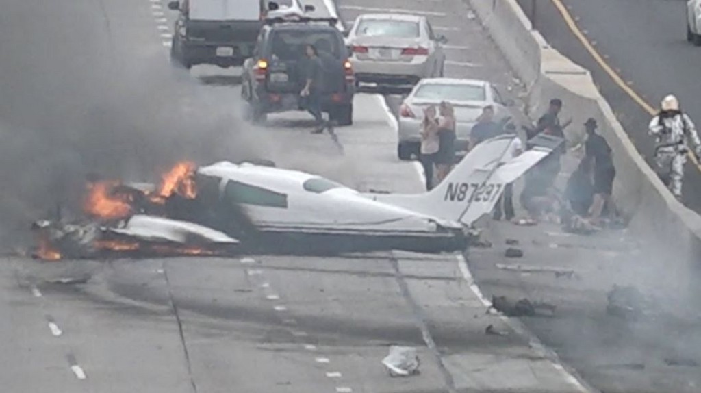 美國加州橘郡(Orange County)一架賽斯納(Cessna)310雙引擎小型飛機在當地時間周五約9時30分失事,墜毀於繁忙的聖地牙哥405高速公路上,撞擊地面後爆炸起火,旁邊一輛車遭受撞擊,機上的一男一女奇蹟生還,不過傷勢嚴重。飛機失事的畫面被一位民眾用手機拍攝下來,影片中可見,飛機逐漸失去動力,在墜毀的前幾秒鐘似乎還有往上拉高,但隨後迅速墜毀。