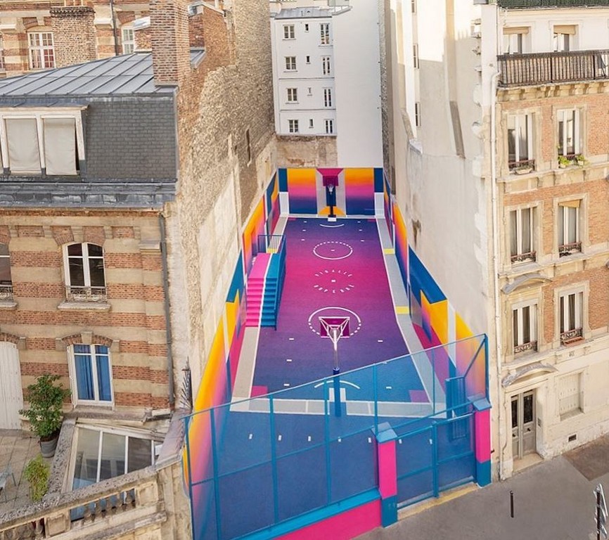 艾希普爾兒時在法國紅燈區皮加勒(Pigalle)長大,因此才改造這個位於他熟悉區域附近的籃球場。這個地方現在正面臨社區轉型,剛好有不少閒置的空間可讓人利用,於是Pigalle便率先示範了空間再造的藝術,以玩味作風把陳舊的籃球場變得宛如運動廣告中的鮮豔場景。