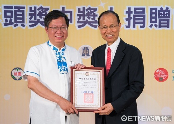 ▲台灣彩券公司董事長薛香川(左一)指出,公益彩券頭獎中獎人送愛心到桃園市,這是第三度捐款!(圖/記者楊淑媛攝)
