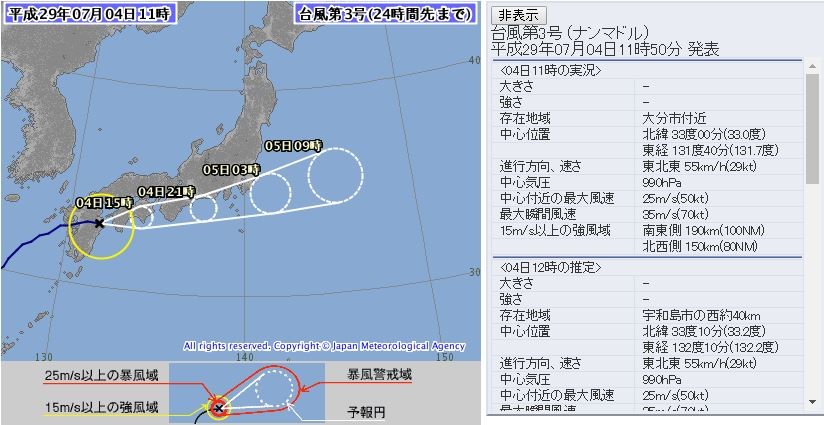 今年第3號輕度颱風「南瑪都」於日本時間4日早上8時左右(台灣時間7時左右)登陸日本九州長崎,強風一度造成九州新幹線部分路段停駛,所幸在上午11時34分時恢復運行。日本氣象廳提醒,南瑪都將帶來超大豪雨,可能會造成土石崩塌、淹水和河水暴漲,預計在4日夜晚至5日清晨通過關西和關東地區,要民眾特別留意。