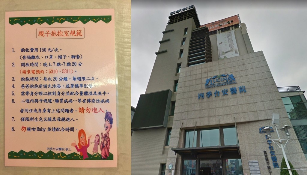 怎麼會有這種事嗎?抱自己的小孩竟要收費,高雄一名產婦投訴,在高雄四季台安醫院附設月子中心做月子,但醫院竟然貼出公告,說明每次的「親子抱抱」要收費150元,單次限時20分鐘,讓這名女子覺得非常不可思議,簡直是在搶錢。