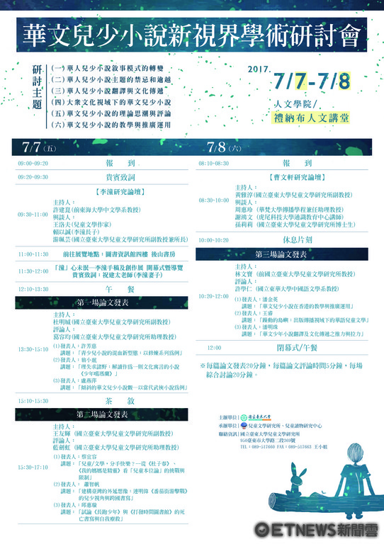 國立台東大學兒童文學研究所長期關注華文兒少小說發展,7月7日至8日在台東大學知本校本部人文學院禮納布講堂舉辦學術研討會,為期兩天的會程分別由兩岸兒少小說作家李潼與曹文軒的研究論壇揭開序幕,並安排三場、共計九篇論文發表。