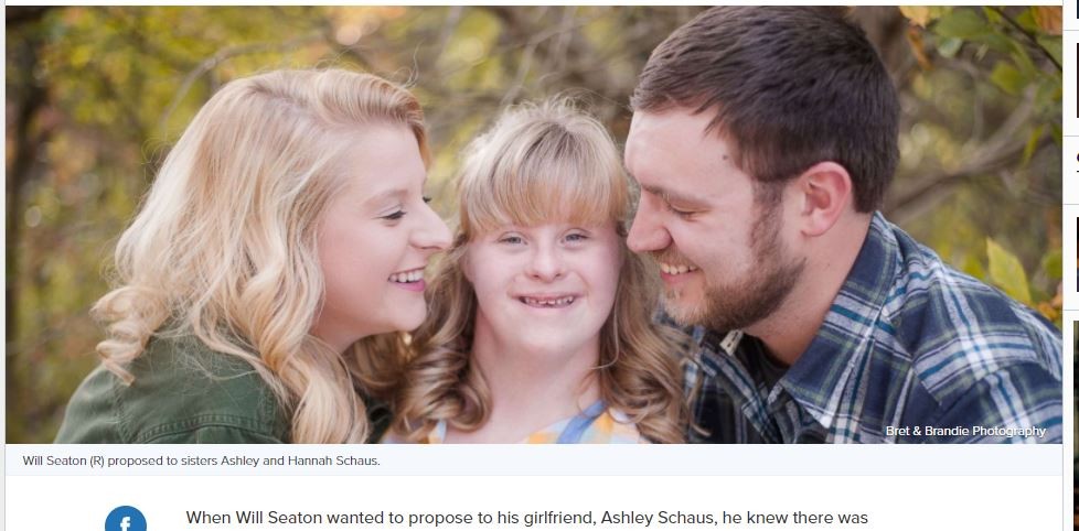 美國印第安納州一名25歲男子威爾(Will Seaton)2016年3月向23歲女友艾希莉(Ashley Schaus)及她妹漢娜(Hannah)求婚,原來因為漢娜患有唐氏症及糖尿病,無法獨自生活,「我不能拆散她們」,便決定同時照顧她們2人一生。