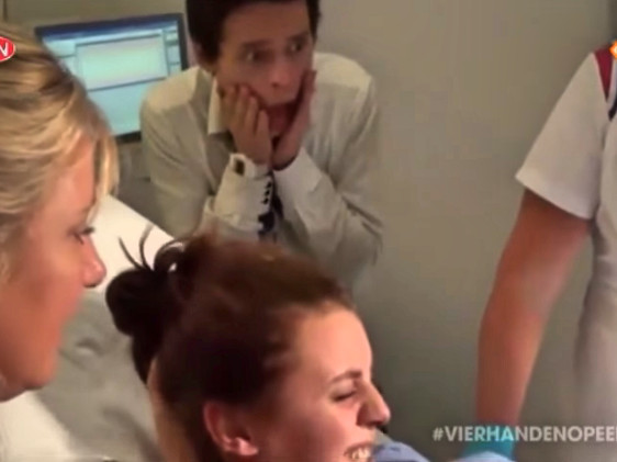 影片一開始,這位新手爸爸輕摸老婆額頭,給予鼓勵,開始生產後,一秒轉變畫風,先用手托住下巴,嘴巴微開,對於自己所看到的表示驚訝,接著出動雙手,將雙手合十,托著臉頰展現驚恐樣,最後甚至遮住全臉,不敢相信自己所看到一切。