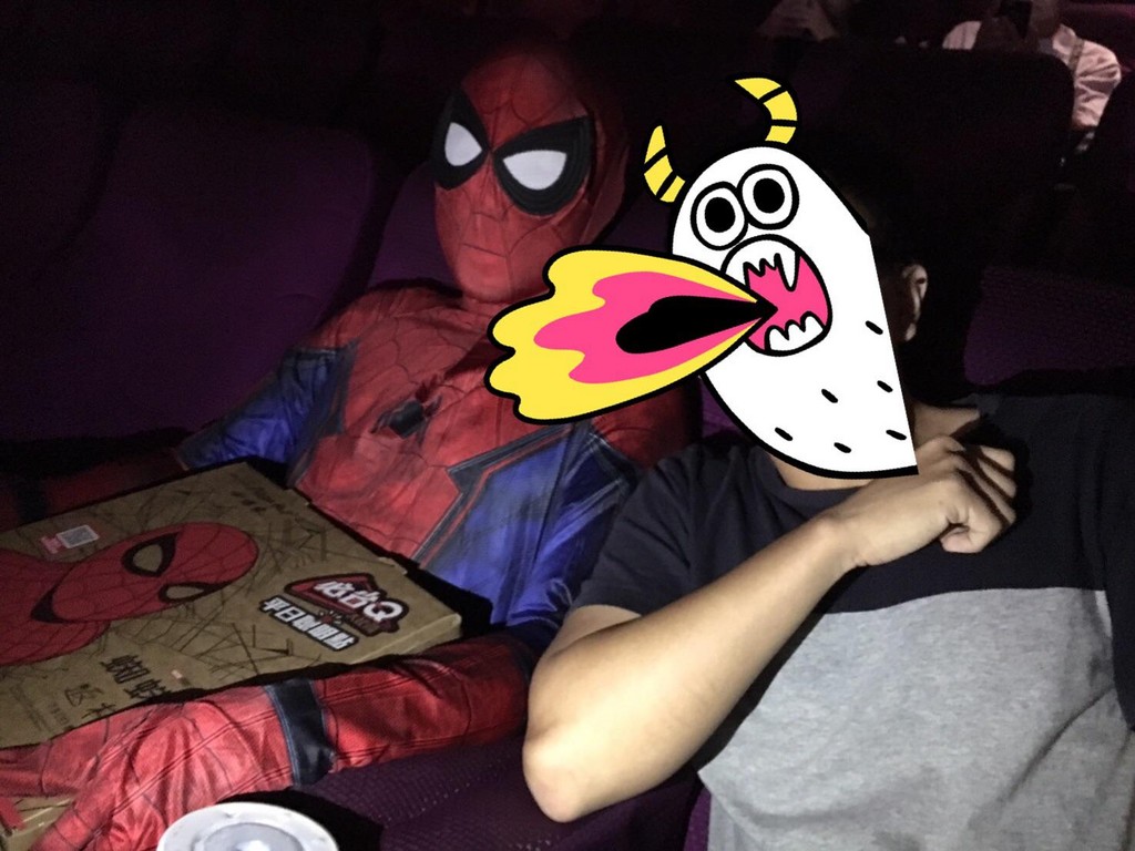 「衣服?有!比薩?帶上!電影?票我付!於是就發生了…穿蜘蛛人吃蜘蛛人比薩看蜘蛛人電影94狂XDDD」。